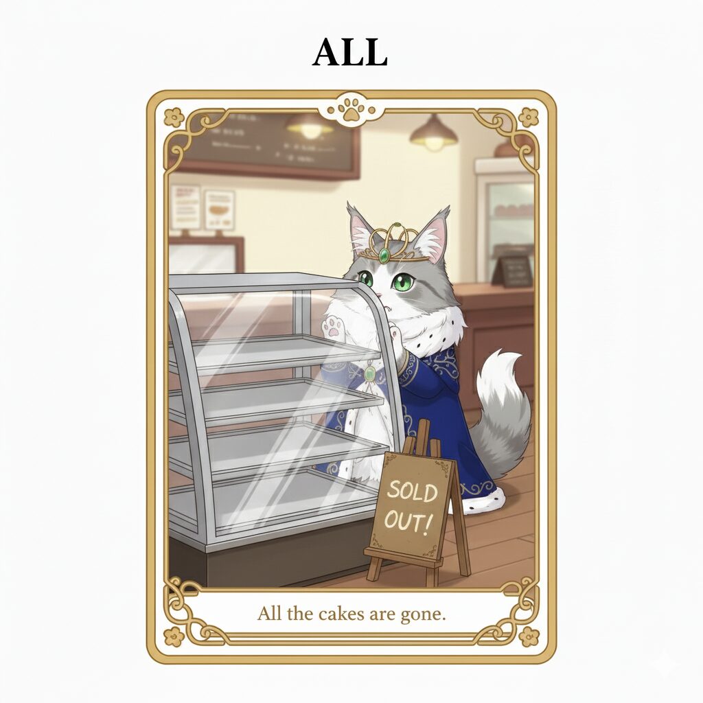ALLは、可算(all messages)、不可算(all the water)どちらの名詞にも使える「全て」。集合や合計のイメージを含むので、沢山のケーキが入っているはずの