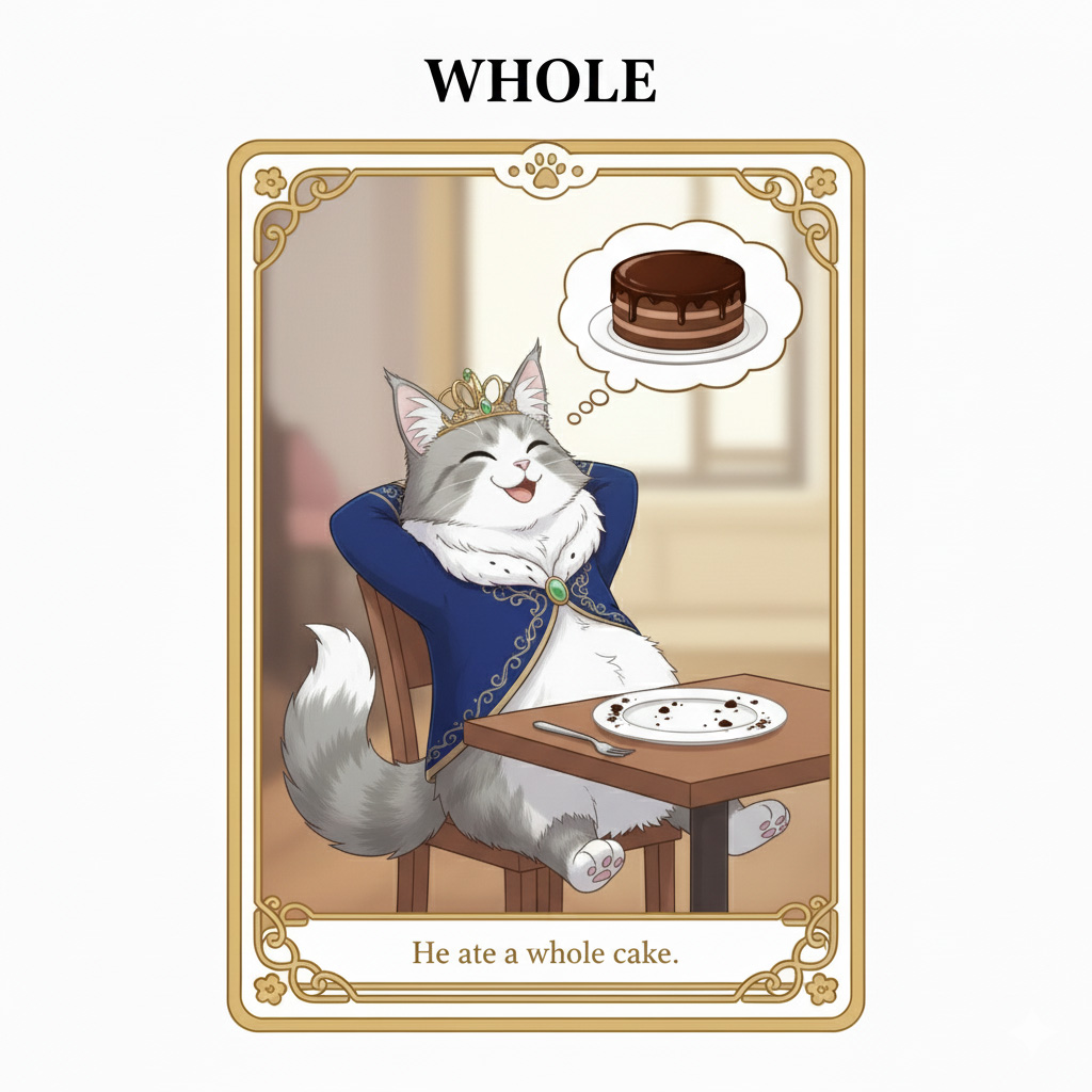 「全て」。名詞、形容詞、副詞など、色々な形で使えます。ここでは完全性を「ホールケーキ、まるごと1つ」で表現してみました。