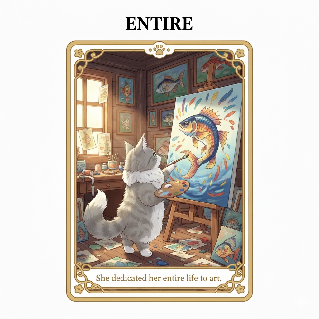 ENTIREは、「全て揃った」や「キズのない」完全性をイメージした「全て」。Wholeと同じ「まるごと」がベースですが、ややフォーマルな時に使われます。猫生を芸術に捧げるという意味で、entire lifeと表現してみました。